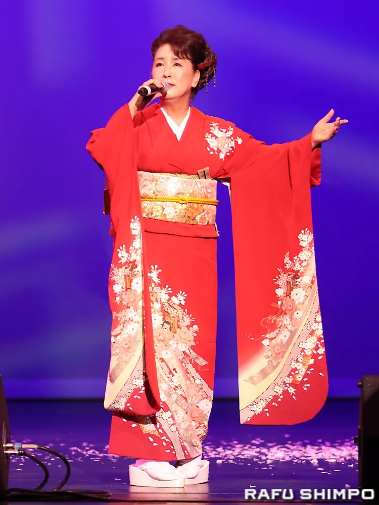 南加県人会協議会の第43回親睦演芸会の第2部はゲスト歌手の小芝陽子が演歌と、自身の原点という詩吟を披露した。9歳から詩吟を始め、中学生で日本武道館で詩舞を演じ、文部科学大臣奨励賞を受賞した実力を誇る小芝は、豊かな声量と抜群の歌唱力で観客を引きつけた。会場を練り歩き観客と握手したり一緒に写真に写ったりしながら、触れ合いを楽しんだ。